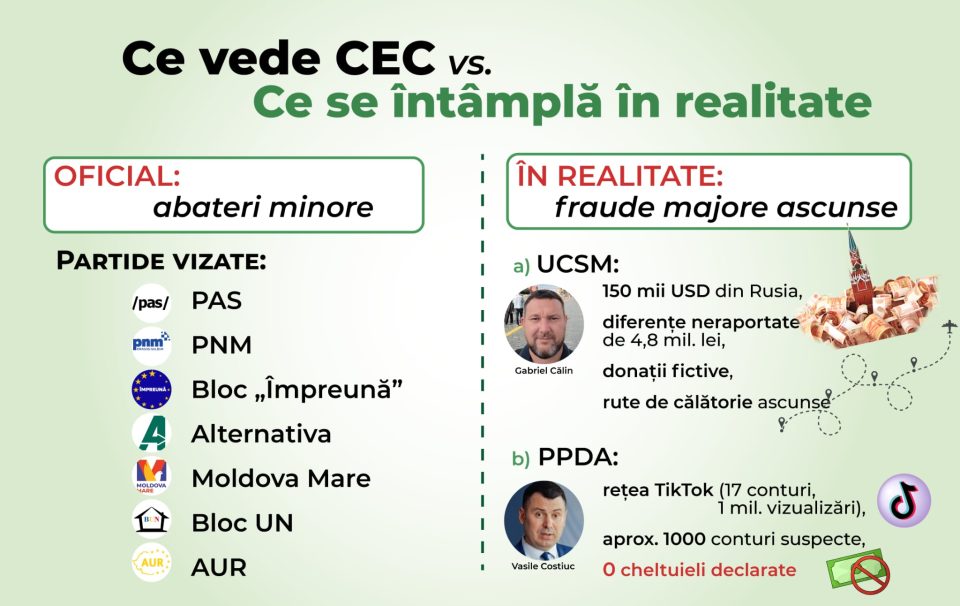 Comisia Electorală Centrală a verificat minuțios rapoartele concurenților electorali în campania pentru alegerile parlamentare din 28 septembrie și a găsit în mare parte doar abateri minore, tehnice sau corectate ulterior. Totuși, mecanismele oficiale nu au reușit să depisteze cel mai grav fenomen: donațiile fictive. În timp ce membrii CEC aplicau atenționări pentru rapoarte întârziate sau rubrici incomplete, unele interceptări din dosare pornite pe finanțarea ilegală a partidelor, publicate de autorități, arată cum unii candidați își finanțau campania prin persoane interpuse, ocolind cu ușurință filtrele de control.