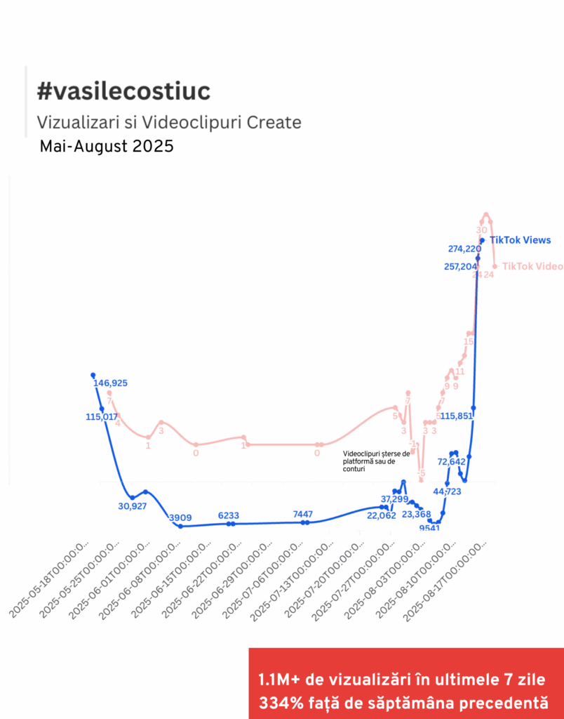 – pe TikTok, o rețea de 17 conturi coordonate a publicat peste 400 de clipuri și a acumulat peste un milion de vizualizări în favoarea lui Vasile Costiuc;