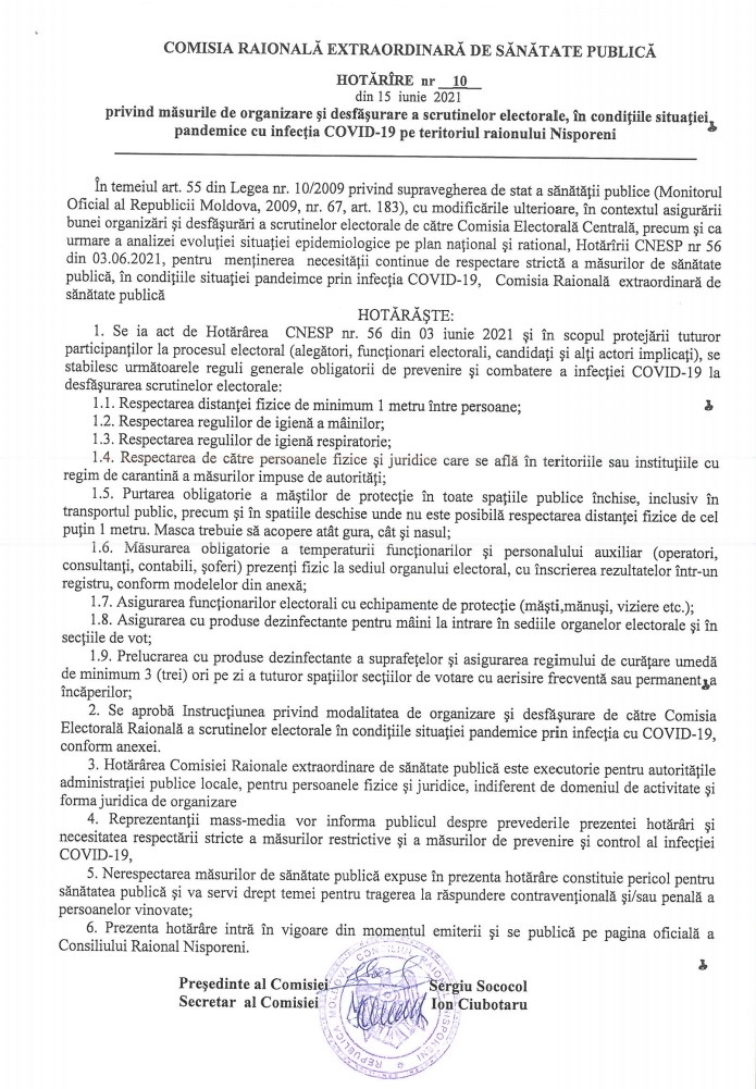 Comisia Raională Extraordinară de Sănătate Publică Nisporeni a emis o hotărâre, în contextul desfășurării alegerilor parlamentare anticipate pe 11 iulie, privind măsurile de organizare și desfășurare a scrutinelor electorale, în condițiile situației pandemice pe teritoriul raionului Nisporeni.