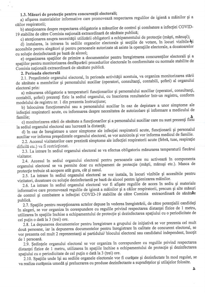 1.9. Prelucrarea cu produse dezinfectante a suprafeţelor şi asigurarea regimului de curăţare umedă de minimum 3 (trei) ori pe zi a tuturor spaţiilor secţiilor de votare cu aerisire frecventă a încăperilor, iar în caz de posibilitate – aerisirea permanentă.