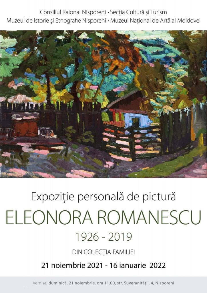 O expoziție comemorativă a pictoriței Eleonora Romanescu, personalitate marcantă în artele plastice în tot spațiul românesc, a fost vernisată pe 21 noiembrie 2021 la Muzeul de Istorie și Etnografie din Nisporeni.