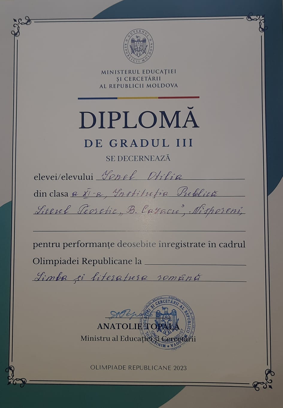 39 de elevi au fost premiați în cadrul Olimpiadei Republicane de Limba și literatura română (limba de instruire), desfășurată la Chișinău în perioada 05-07 mai 2023. Printre aceștia se regăsește și Ionel Otilia, eleva clasei a XI-a „D”, din cadrul Instituției Publice Liceul Teoretic „Boris Cazacu” din orașul Nisporeni. Eleva a fost ghidată de profesoara Eșanu Valentina și s-a clasat pe locul III, cu un punctaj de 81 de puncte.