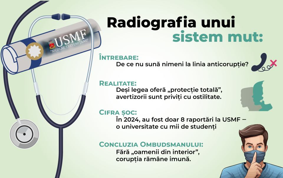 În Republica Moldova, Legea privind avertizorii de integritate obligă entitățile publice, inclusiv USMF, să instituie canale interne de raportare confidențială și să asigure protecția totală a avertizorilor împotriva oricăror măsuri de repercusiune, precum hărțuirea, concedierea sau discriminarea. În opinia Olgăi Cernețchi, prim-prorector al USMF, cadrul normativ a fost consolidat progresiv după anul 2018, fiind aprobat anual un plan de acțiuni pentru combaterea corupției. În cadrul instituției funcționează o Comisie de etică responsabilă pentru examinarea cazurilor de încălcare a Codului moral al instituției, existând registre oficiale pentru reclamații și multiple canale de raportare: e-mailuri dedicate, o linie telefonică anticorupție 24/24 și sistemul de raportare anonimă – așa-numitul Sistem Informațional de Management Universitar.